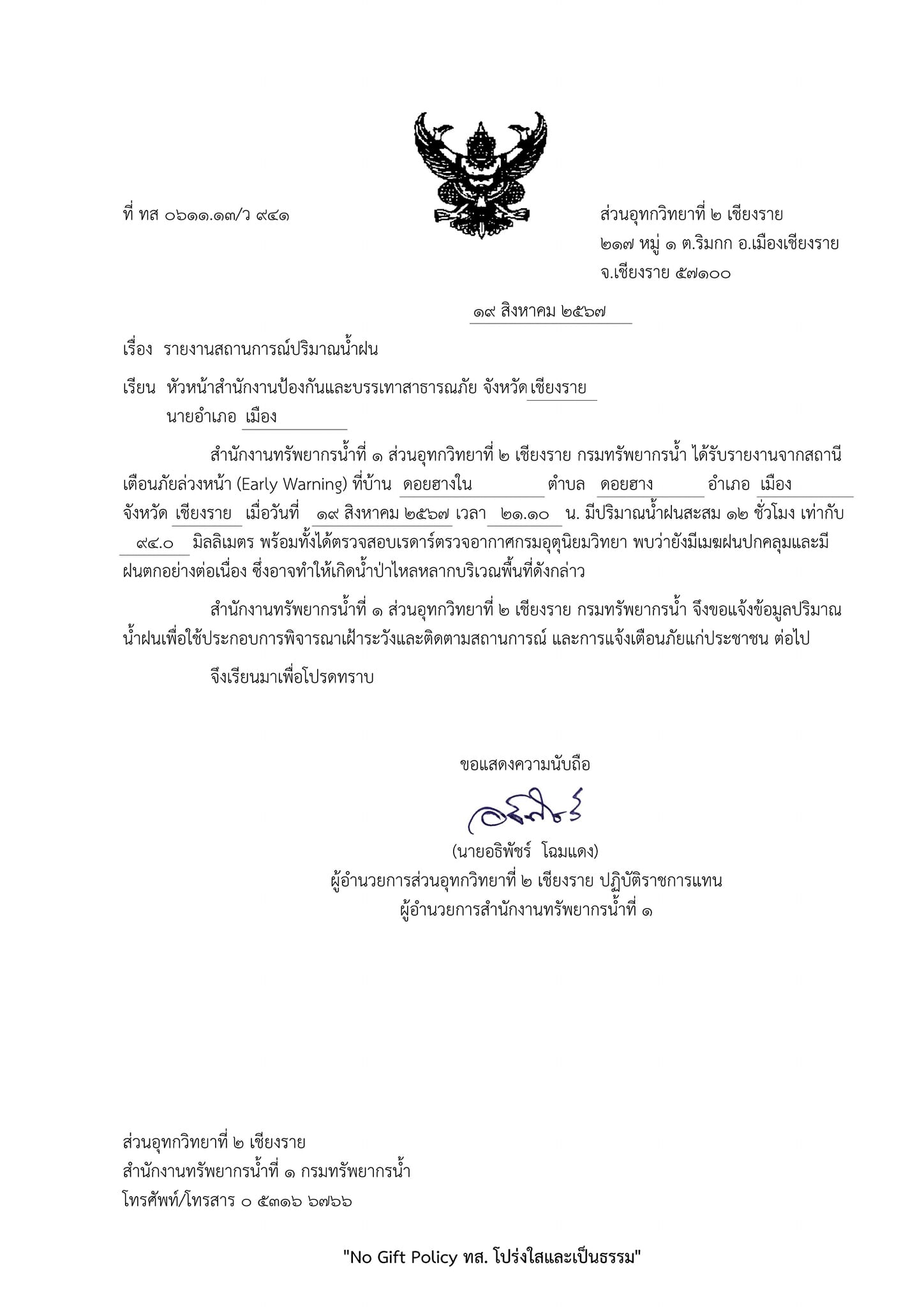 แจ้งข้อมูลเตือนภัยเฝ้าระวังสถานการณ์อุทกภัย