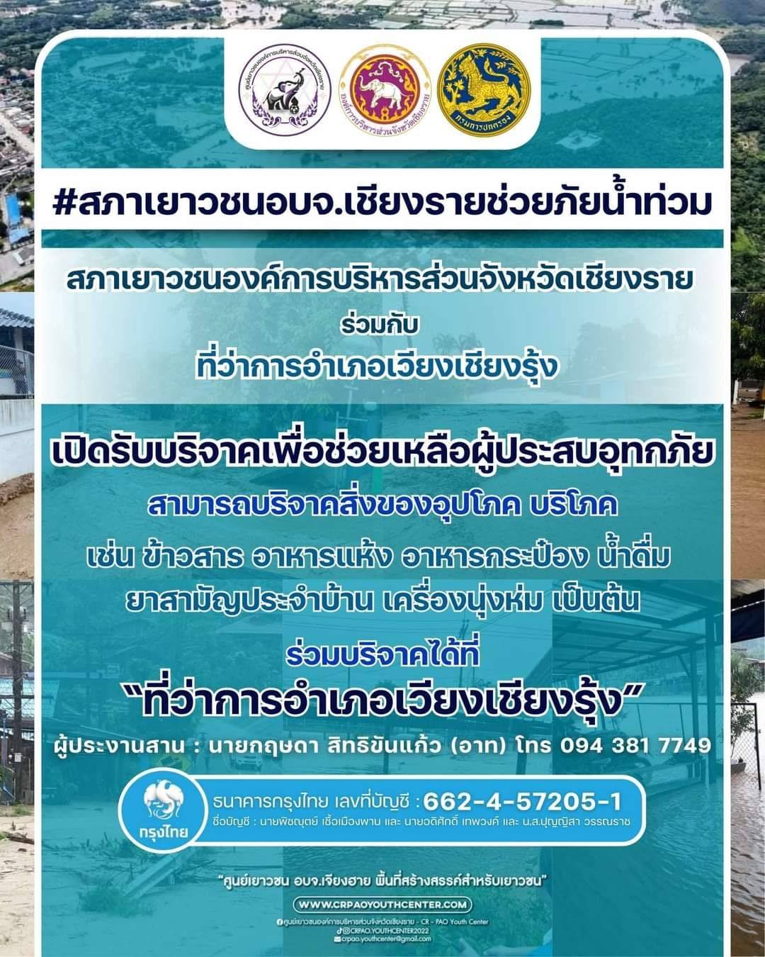 เปิดรับบริจาคเพื่อช่วยเหลือผู้ประสบอุทกภัยในพื้นที่จังหวัดเชียงราย สิ่งของอุปโภค บริโภค เช่น ข้าวสาร อาหารแห้ง อาหารกระป๋อง น้ำดื่ม ยาสามัญประจำบ้าน เป็นต้น