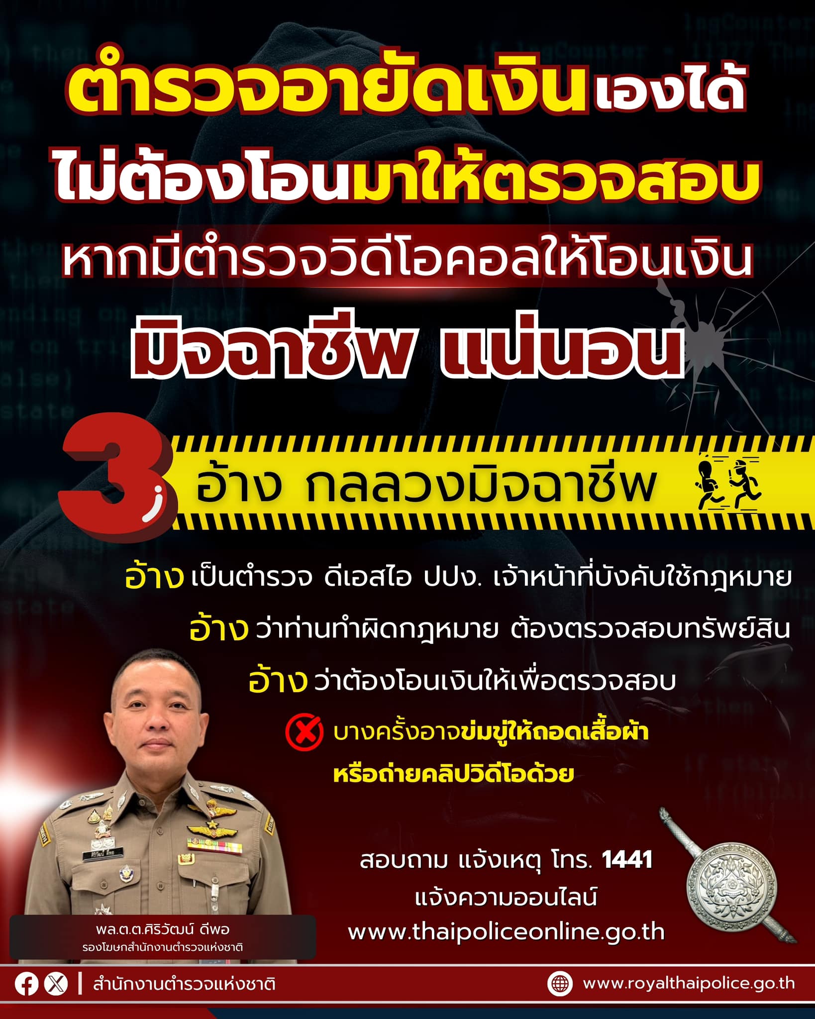 หากพี่น้องประชาชนพบเห็นเจ้าหน้าที่ตำรวจ หรือเจ้าหน้าที่ของรัฐ ใช้วิธีการวิดีโอคอลหาท่าน เพื่อโน้มน้าวหรือข่มขู่ให้ท่านโอนเงิน เพื่อแสดงความบริสุทธิ์ใจ เพื่อให้เจ้าหน้าที่ตรวจสอบ หรือบางครั้งอาจข่มขู่ถึงขั้นให้ถอดเสื้อผ้า ถ่ายคลิปวิดีโอ ขอให้พี่น้องประชาชนนึกไว้ก่อนเลยว่าเป็นมิจฉาชีพแน่นอน