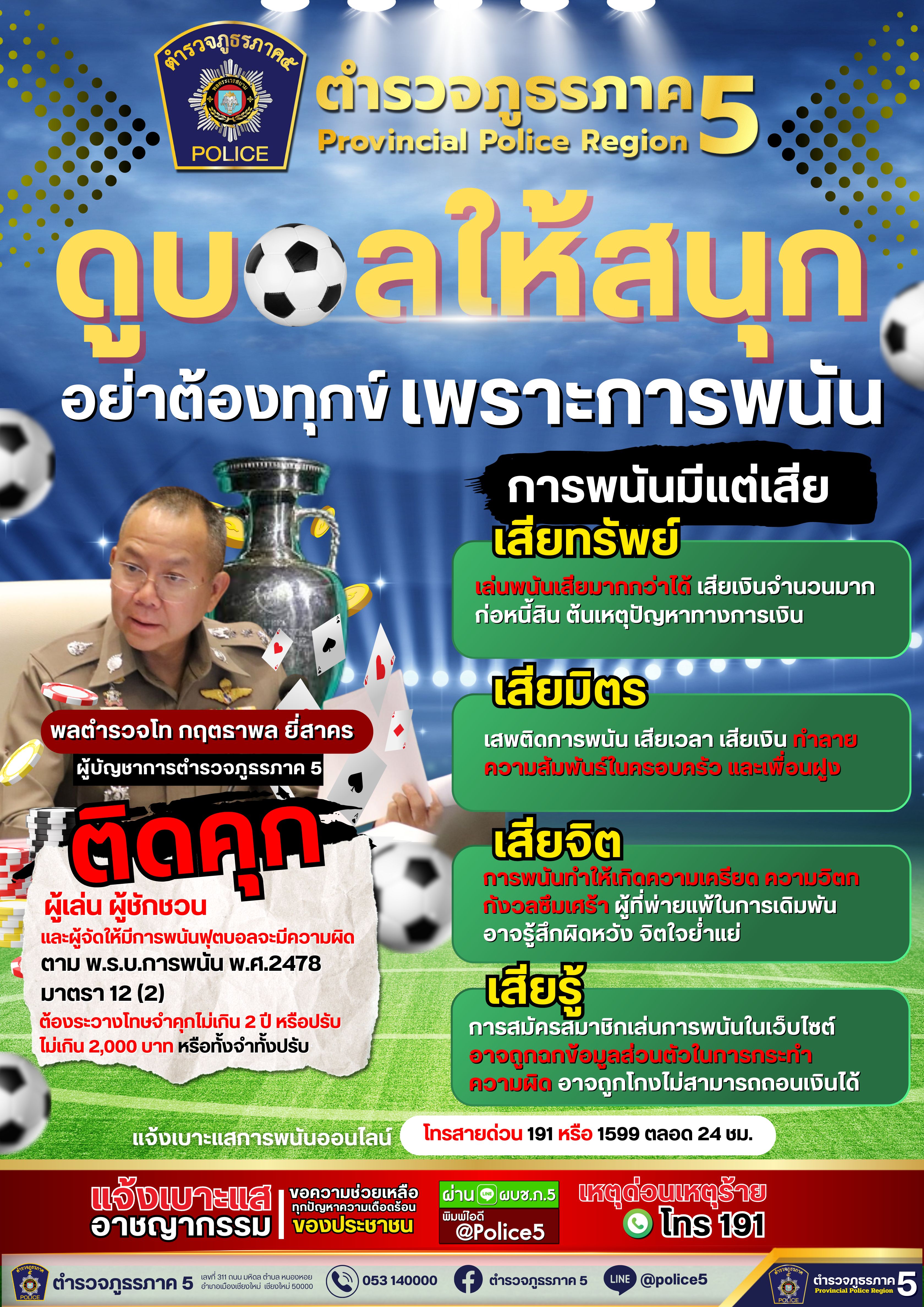 แจ้งมาตรการป้องกันและปราบปรามการลักลอบเล่นการพนันทายผลการแข่งขันฟุตบอลชิงแชมป์แห่งชาติยุโรปครั้งที่๑๙ หรือฟุตบอลยูโร ๒๐๒๔ (UEFA European Football Championship 2024) ณ ประเทศเยอรมนี ระหว่างวันที่ ๓๔ มิ.ย. -๔ ก.ค.๖๗ โดยมีการถ่ายทอดสดผ่านทางสื่อโทรทัศน์และสื่ออื่น ๆ ให้ประชาชนได้รับชมการแข่งขันพร้อมกันทั่วโลก ตร. คาดว่าจะมีผู้ลักลอบเล่นการพนันทายผลการแข่งขันฟุตบอลครั้งนี้อย่างแพร่หลาย อันอาจเป็นเหตุให้กลุ่มนักเรียน นักศึกษา เยาวชน หรือประชาชนทั่วไปตกเป็นเหยื่อเข้าไปเล่นการพนันหายผลการแข่งขันฟุตบอลได้
