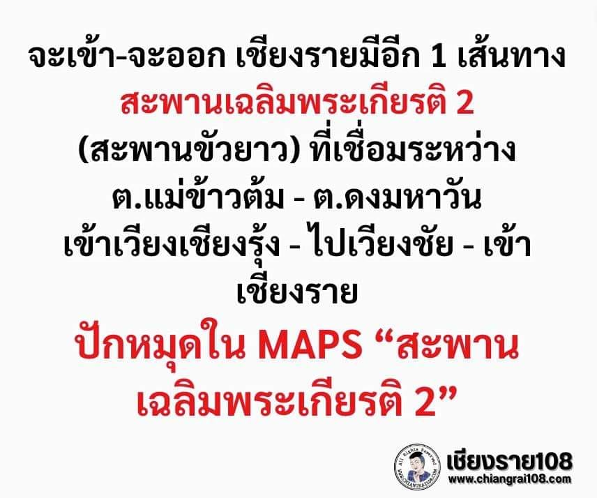 อัพเดทเส้นทาง ท่านใดที่กำลังจะเดินทางเข้าสู่สนามบิน หรือจะเข้าบ้านดู่, อำเภอแม่จัน, อำเภอเชียงแสน, อำเภอแม่สาย ขณะนี้เส้นทางบ้านไตรแก้ว อำเภอเวียงชัย เข้าสู่สะพานเวียงกือนา ได้ปิดการใช้เส้นทางชั่วคราว